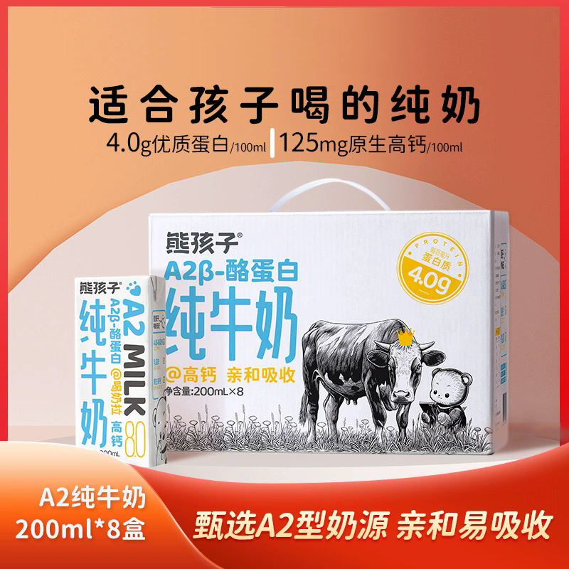 熊孩子A2-β酪蛋白纯牛奶200ml*8盒(4.0g乳蛋白/原生 高钙)